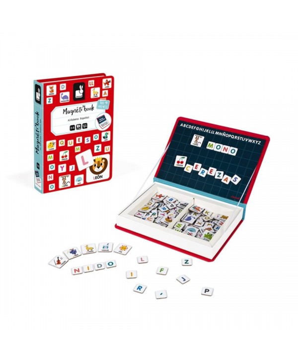 Juego educativo magnético de cartón para aprender el alfabeto en español. Compuesto por 28 imanes con ilustraciones y 116 imanes con letras. Una vez se ha abierto el libro, el objetivo del juego es escribir correctamente en la escena la palabra que indica cada imán con ilustración.