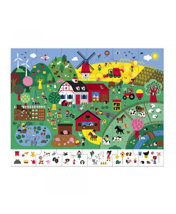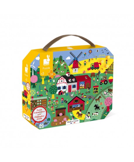 He aquí un bonito puzle de cartón de 24 piezas lujosamente ilustrado sobre el tema de la granja. El tamaño de las piezas está adaptado a las manos más pequeñas para facilitar el montaje del puzle. ¡Una vez que hayas terminado el puzle, diviértete buscando las 29 ilustraciones ocultas! Este práctico puzle se guarda en el interior del bonito maletín con asa para un transporte fácil y para no perder nunca las piezas. Fabricado en Francia. Cartón con certificación FSC y tintas vegetales.