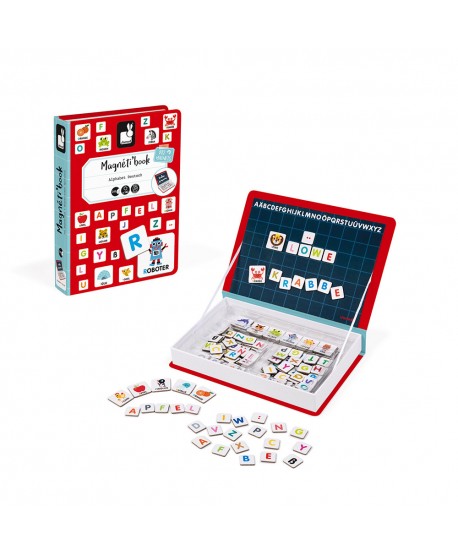 Juego educativo magnético de cartón para aprender el alfabeto en alemán. Compuesto por 26 imanes con ilustraciones y 116 imanes con letras. Una vez se ha abierto el libro, el objetivo del juego es escribir correctamente en la escena la palabra que indica cada imán con ilustración.