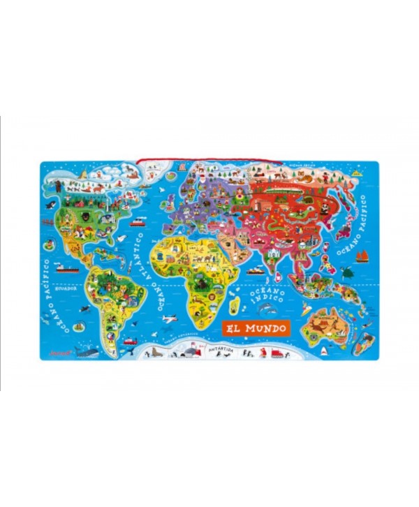 Juego didáctico magnético sobre el tópico del atlas mundial. ¡Un viaje por el mundo a través de 92 piezas magnéticas ilustradas! Cada pieza magnética representa un país o una región del mundo, con su correspondiente nombre, capital y una ilustración característica de dicha parte del globo. El tablero magnético de gran formato representa el mundo con sus continentes, mares y océanos: el color utilizado para cada región permite identificarlas.