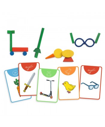 En Kelbazar de Djeco, los jugadores deben hacer que los demás adivinen objetos cotidianos, juguetes o animales, utilizando solo las 17 formas geométricas de madera y fichas de colores. Cada ficha representa un objeto o cosa con fondo rojo, un juguete con fondo amarillo o un animal con fondo verde, ofreciendo variedad y desafío.